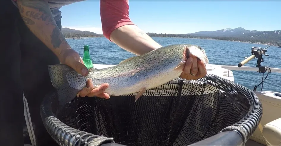 There are 2 Scotty downriggers on each boat so we do not use lead core line. Using a 3 foot boom, some cable and a 8lb lead fish looking weight. This allows us to clip our fishing lines to the 8lb lead fish weight and cable. Lowering the downrigger to depths from 1-30 feet below the water surface where the trout like to swim.. Then when the trout bites the lure or bait the fish pulls the line of the clip. Then it's just you and the fish. With an aditional 2 lines on the surface called flatliners. Trolling around Big Bear Lake with 6 lines in the water at one time.
